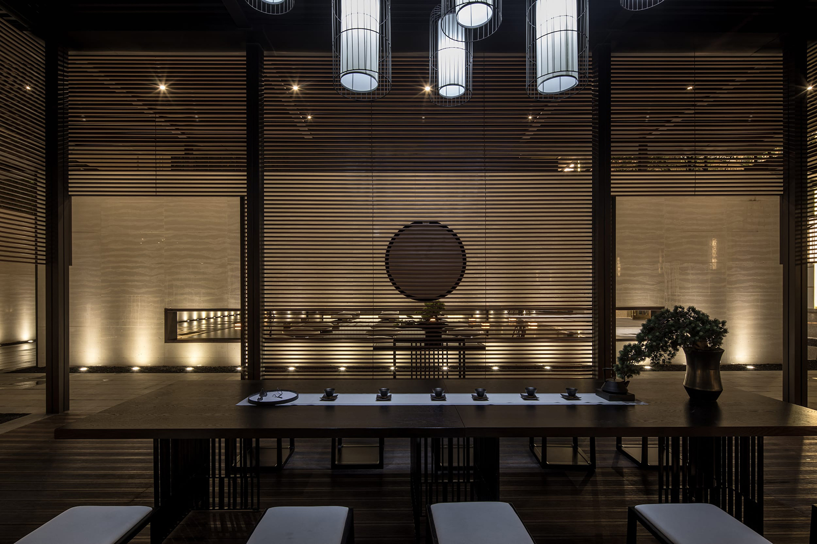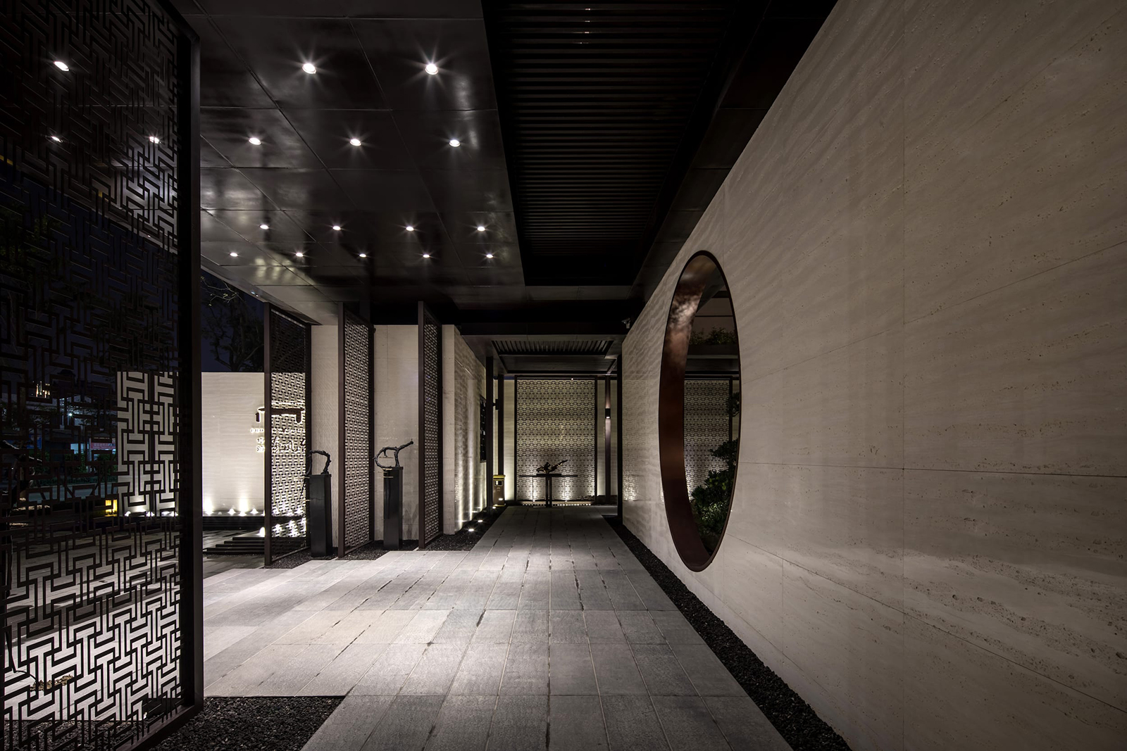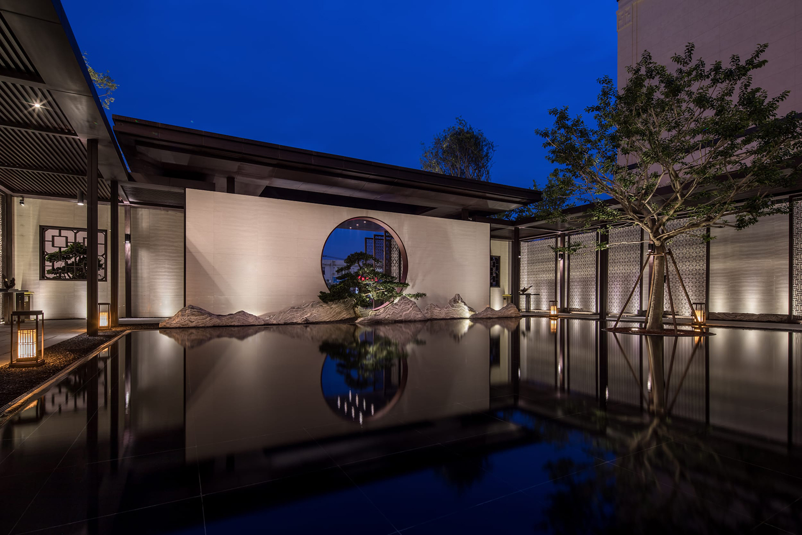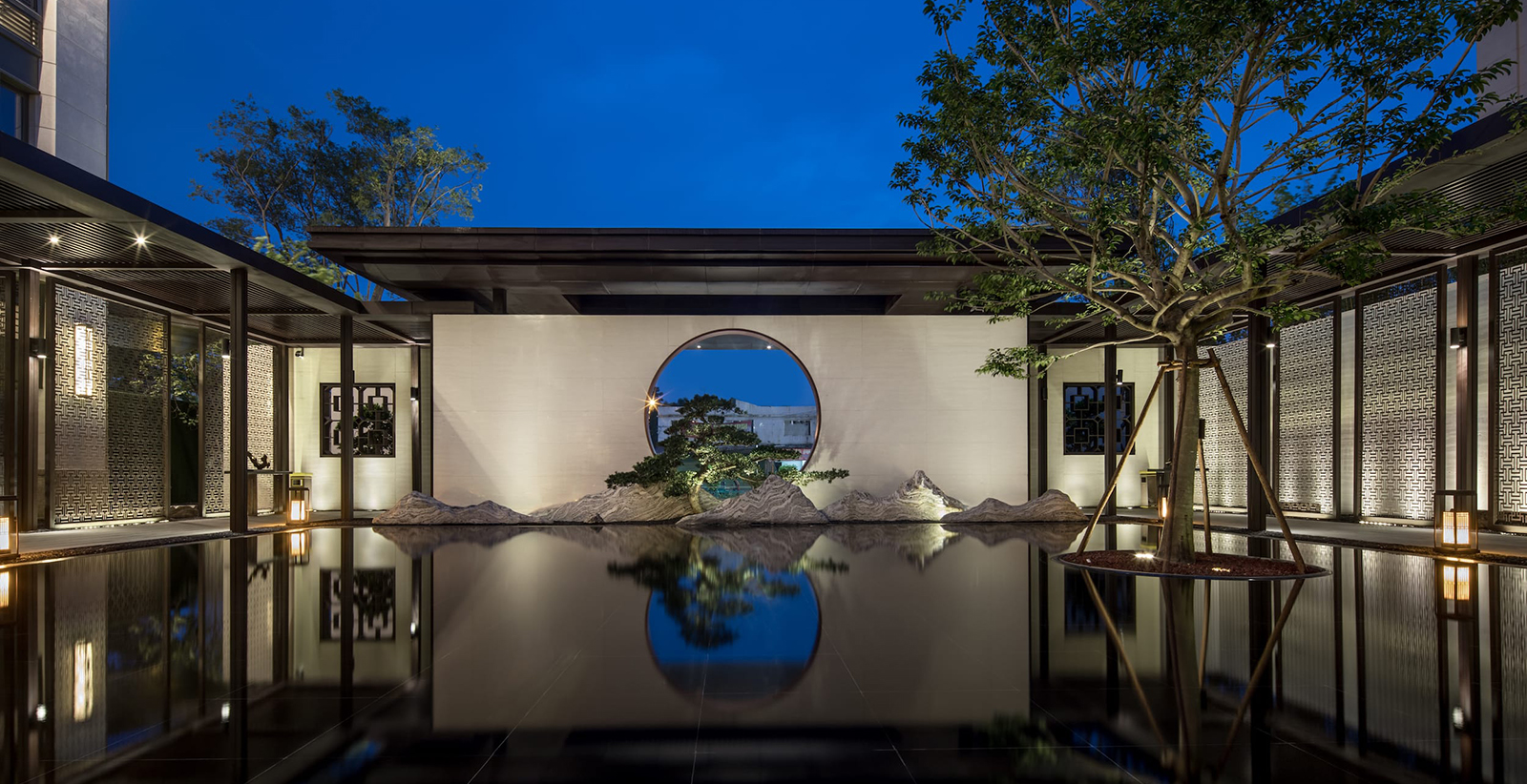 中心水景花園作為中軸核心,東入口向園而行,途徑極具東方雅韻的禪意枯山水,一橋轉(zhuǎn)折入境,借新中式設(shè)計手法,由虛轉(zhuǎn)實(shí),虛實(shí)絞合,將山水理念融匯其中,鏡水回廊營造水天大境,張弛有度的描繪一幅大氣優(yōu)雅的現(xiàn)代山水畫卷。意境脈絡(luò)從西入口至中園同樣的上演:穿過屏風(fēng)、月洞景墻,藏著一片唯美山水畫境:水廊鏡天、松石浮玉皆歸此園。不分遠(yuǎn)近,不知高下,月洞之后,更像一個故意的偶然,一點(diǎn)點(diǎn)構(gòu)建游園的驚喜。