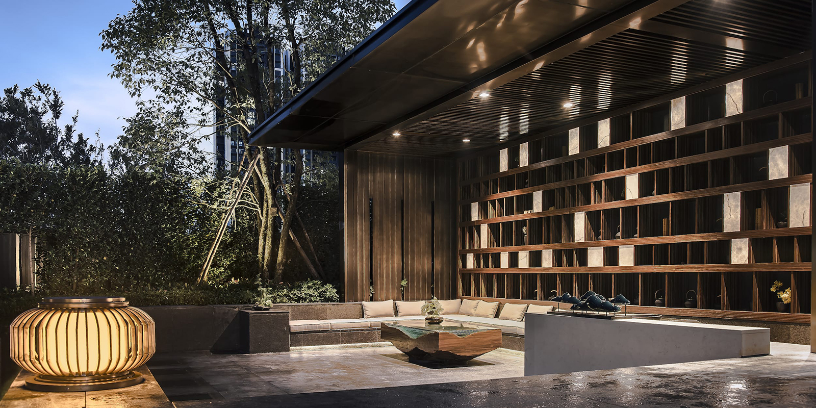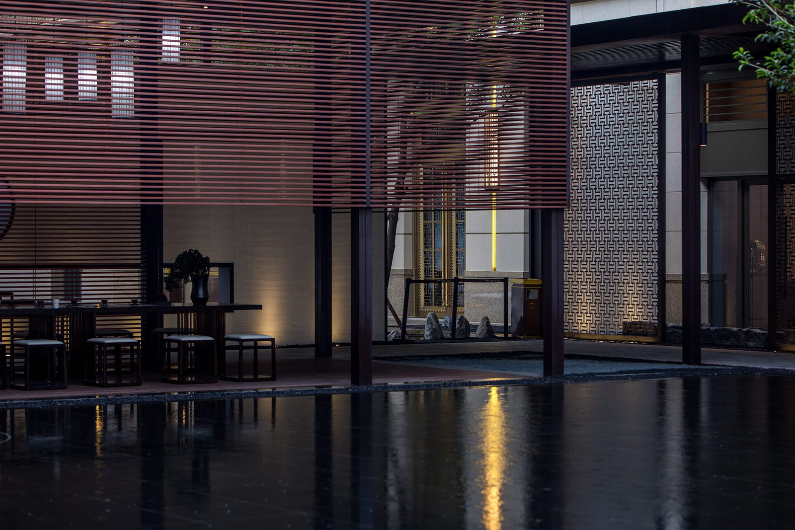 府院境的林泉是文人的林泉,將山水的形意融入到方寸的玉器上是古人表達(dá)喜愛的方式。西入口借助5.45米的內(nèi)外高差,采用六寶歸家禮制,門頭、御燈、光階、疊水、照壁、三山六大景觀元素,禮溯一宅風(fēng)水,規(guī)制禮儀,疊水瑯瑯如玉鳴,千里江山圖絹畫山水照壁,格柵之后設(shè)一池三山枯山水制境,兩側(cè)林蔭成趣,猶如境入山林,將臺、池、壁、光影等意境提煉、演化并植入場地,再現(xiàn)一幅具有文人林泉形意的現(xiàn)代山水畫卷。