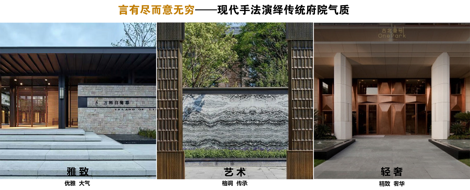 居者歸家,表現(xiàn)一個府系主題的入口,通常是厚重的。若想舉重若輕的傳達(dá)府園的高貴感,文化意境的融入和儀式感的空間轉(zhuǎn)換應(yīng)不可或缺。