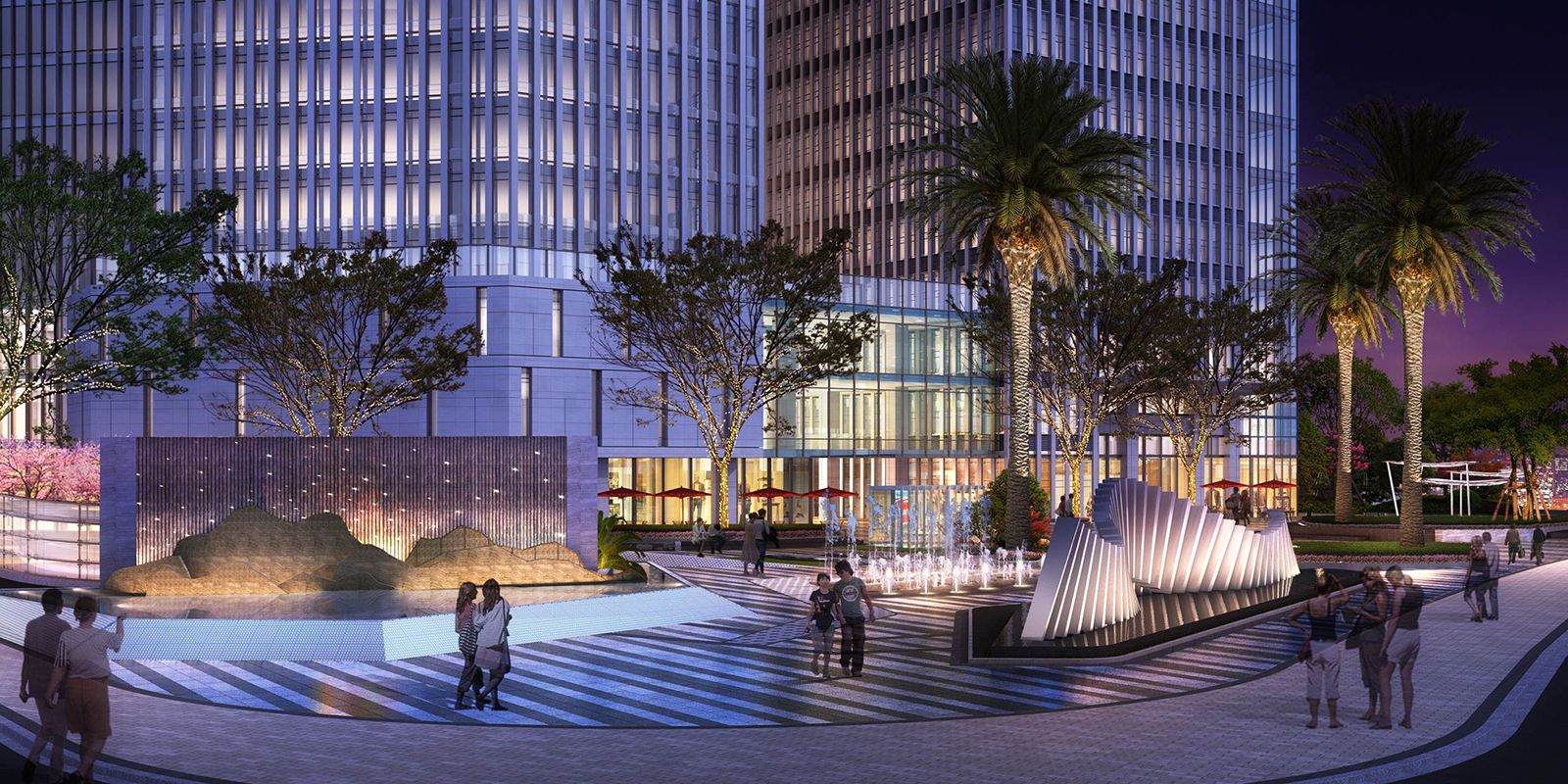廣場界面以全新的手法演繹現(xiàn)代氣質(zhì),漢水之光異形景觀裝置,模擬流經(jīng)尚水灣漢水水灣曲線,將放射線由低至高、前后倒匐、線性蜿蜒,曲線營造出獨(dú)有的韻律感,與漢江形成生動呼應(yīng)人行走之間所見之狀隨之而變。