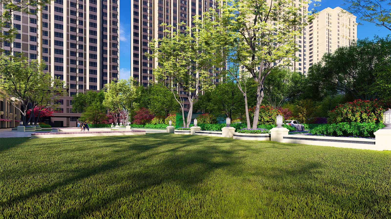 林蔭與步道結(jié)合的圍合成一片靜幽的歸家空間,漫步于林蔭之下,清風徐來微微涼, 為住戶提供宅前一片休憩的愜意空間,樹影婆娑,悠然自得。