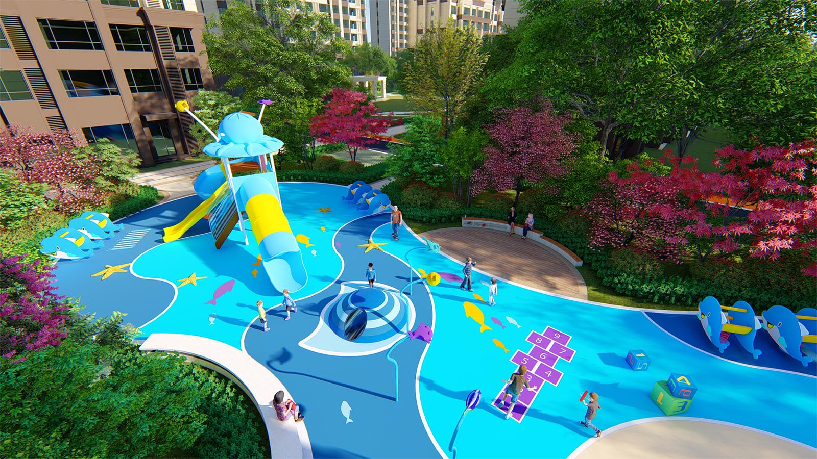 親子樂園以“海洋逐夢” 為設(shè)計主題,在夢幻的海洋中,感受不同成長階段的兒童樂趣并將之珍藏在記憶中,