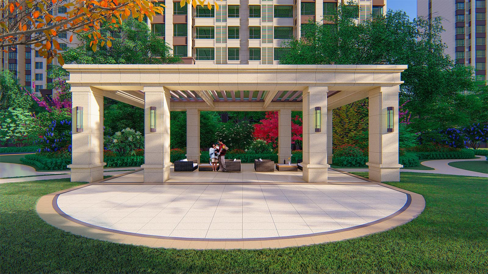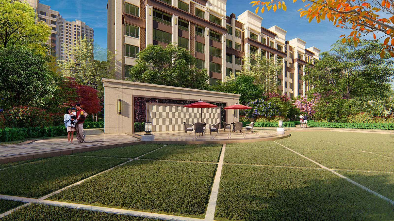 有溫度的社區(qū),尤其注重景觀的實用性,在地塊最中心的區(qū)域,設(shè)計提煉室外景觀會客廳的概念,讓景觀不單單只是一個簡單的構(gòu)架,而是為居者日用的生活場所。