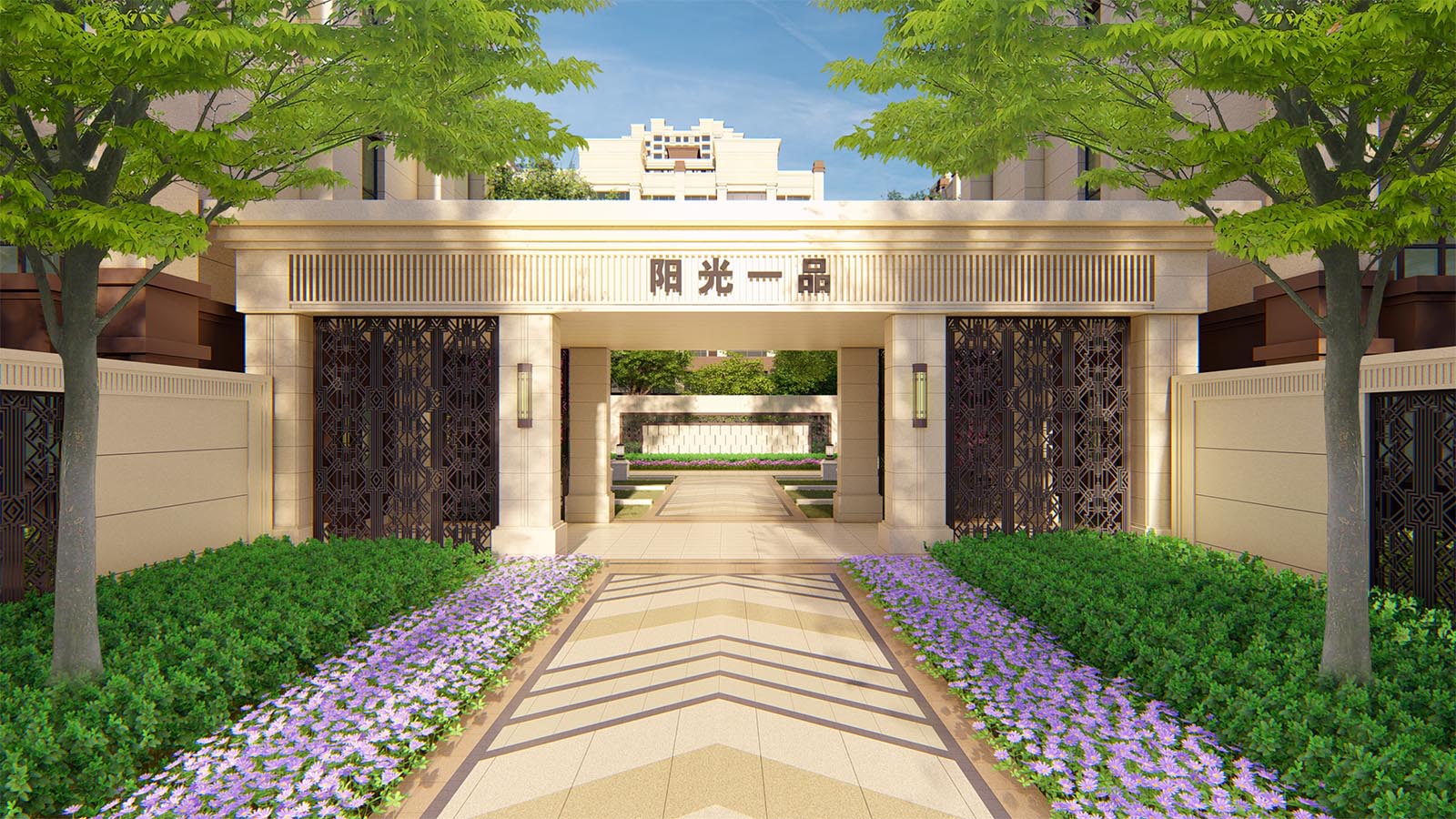 南入口景觀將純粹的古典美學延伸發(fā)展,摒棄直白的古典線角的模仿,轉(zhuǎn)而采用復合現(xiàn)代都會裝飾符號的抽象提煉和現(xiàn)代表達,將雅致與精工匠藝相結(jié)合,塑造舒朗、細膩的歸家禮敘。