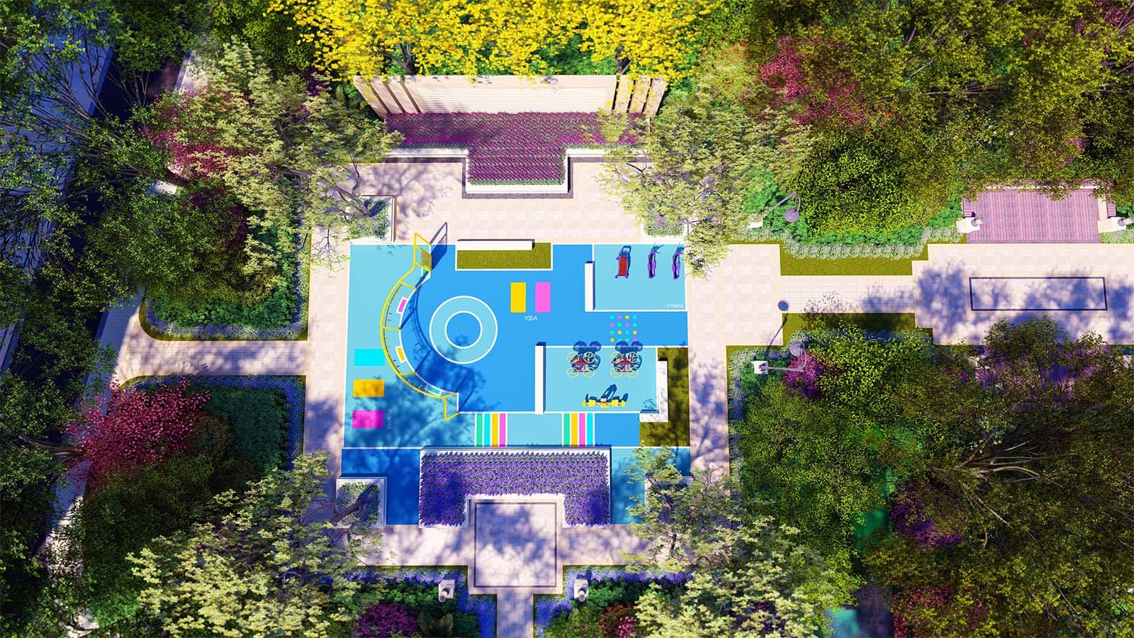 景觀上將其設(shè)置在地塊西北隅,降低運動對居民的影響,規(guī)劃設(shè)計綜合性的多功能成人健身場地,