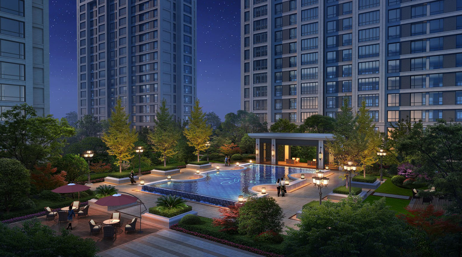 46#-48#樓宅間,為業主呈現最靜謐、舒心的精致鏡面水景,休閑廊架、木平臺與林蔭相伴,水面燈光優雅、浪漫,融光和影,曼妙唯美,讓業主更加貼近自然,功能上同時作為業主會客訪友的“景觀會客廳” ,為業主打造真正的心靈居所,靜謐優雅、詩意棲居生活。