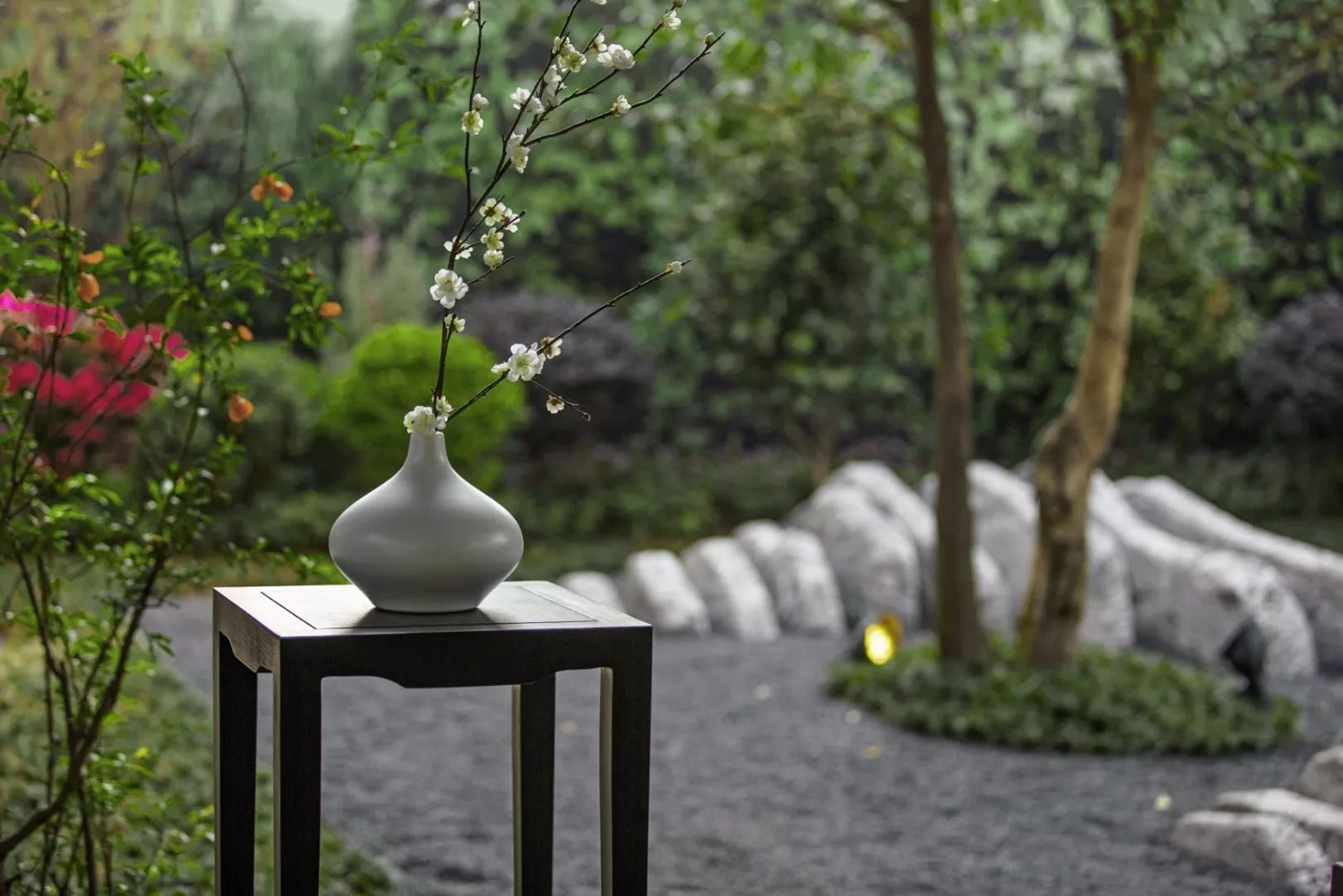 灰白砂石與草坡帶來的景觀明暗變化,縹緲云煙畫卷開,山峰染墨凈塵埃,山水畫卷之后呈現(xiàn)盛世華府清凈質(zhì)感。白沙入霧綠島如云,砂石又可為砂庭出入路徑,又自成一道風景。