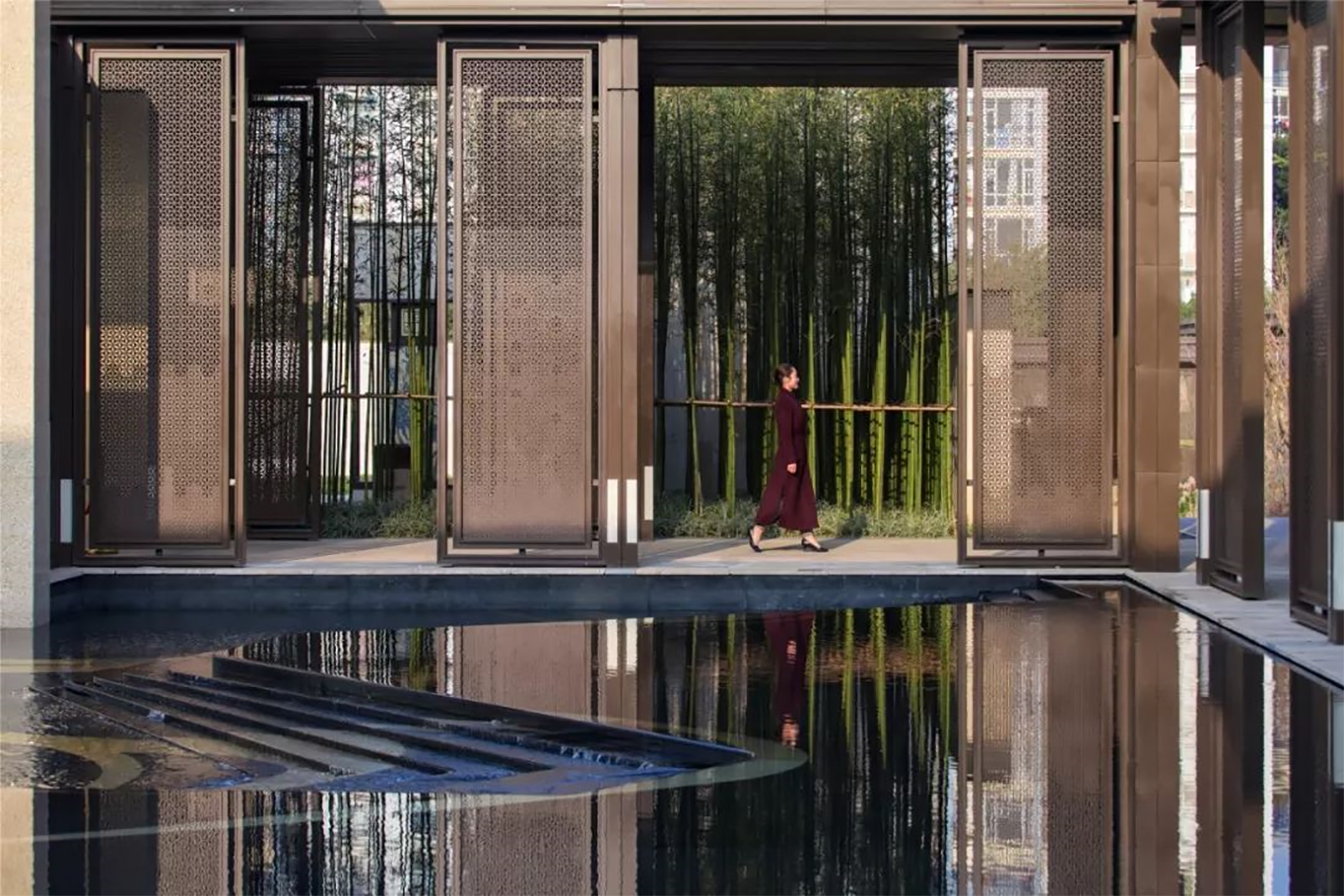 園林是第二自然,我們在庭院內(nèi)追求山水林泉之樂。以模仿和藝術化處理自然形態(tài)為主,創(chuàng)造自然式的園子。以水池為中心,是中國傳統(tǒng)造園的常用手法。明鏡的水面形成寬廣的空間,營造清澈、幽靜、開朗的感覺,池底采用黑色基地,如淵如墨,靜謐深邃,再與曲折的回廊形成開合對比,豐富了觀景感受。