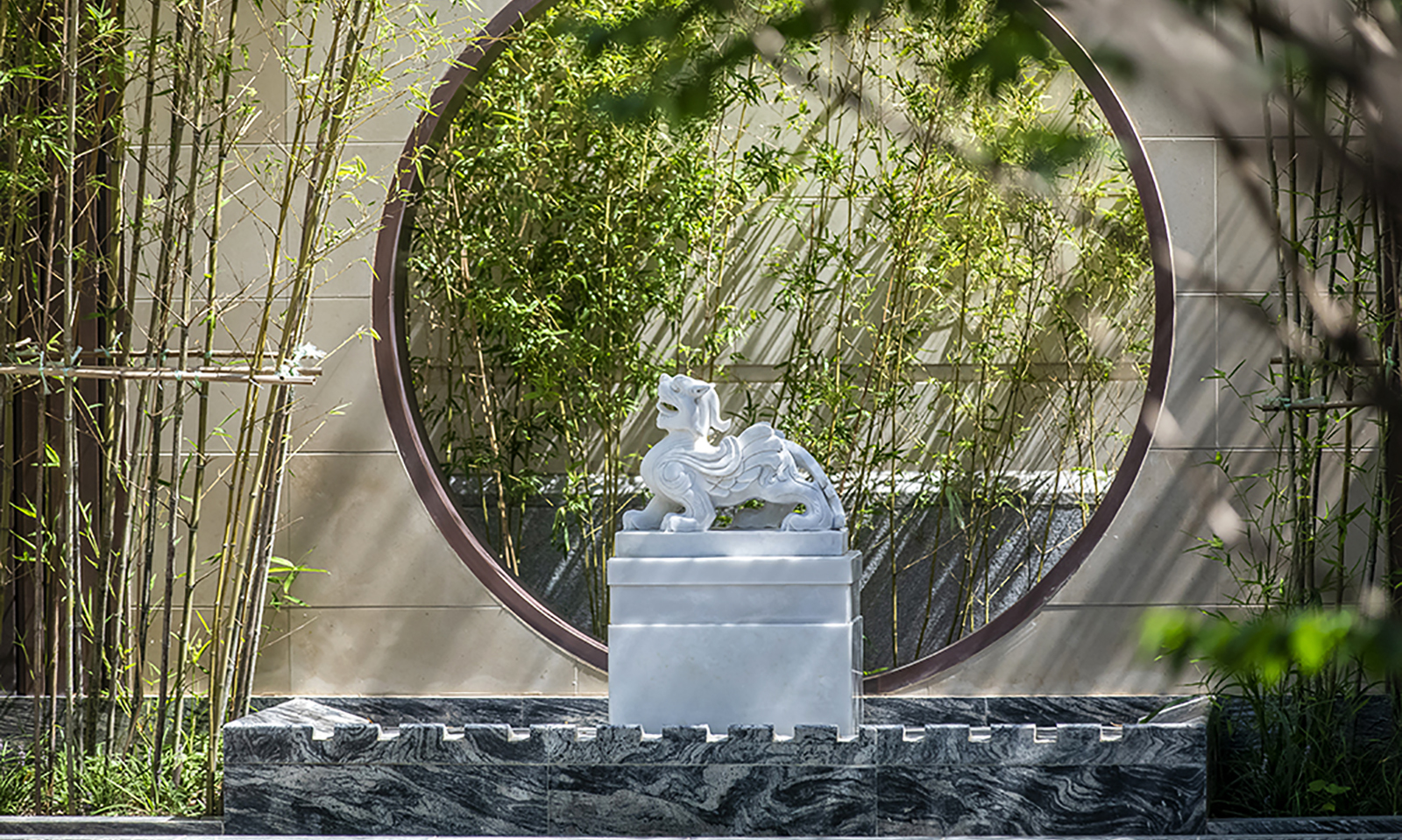 作為一進、三進之間的起承過渡空間,整個空間采用空寂手法,舒朗雅致,對景景墻,猶如大墨揮毫,筆下千變,雄渾激蕩,勢如卷席,一副天下風云乾坤鋪陳于上,令人胸懷更為寬廣,氣度尤為從容。